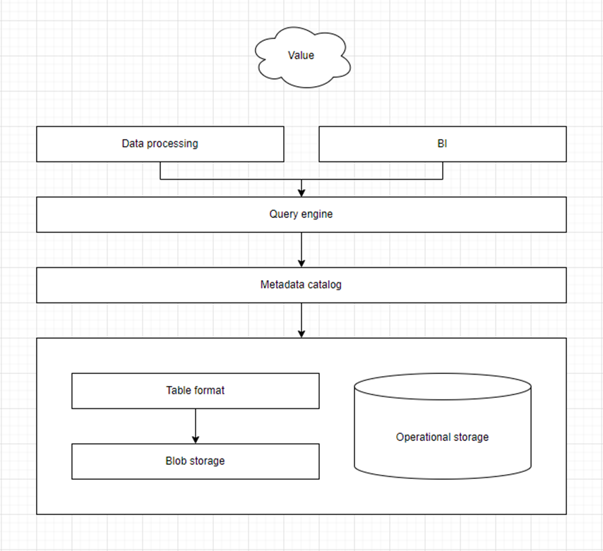 Il est à noter que certaines couches sont optionnelles, il est parfaitement possible d'avoir un query engine directement sur un blob storage. En revanche, la couche table format et metadata catalog vont souvent étroitement liées.